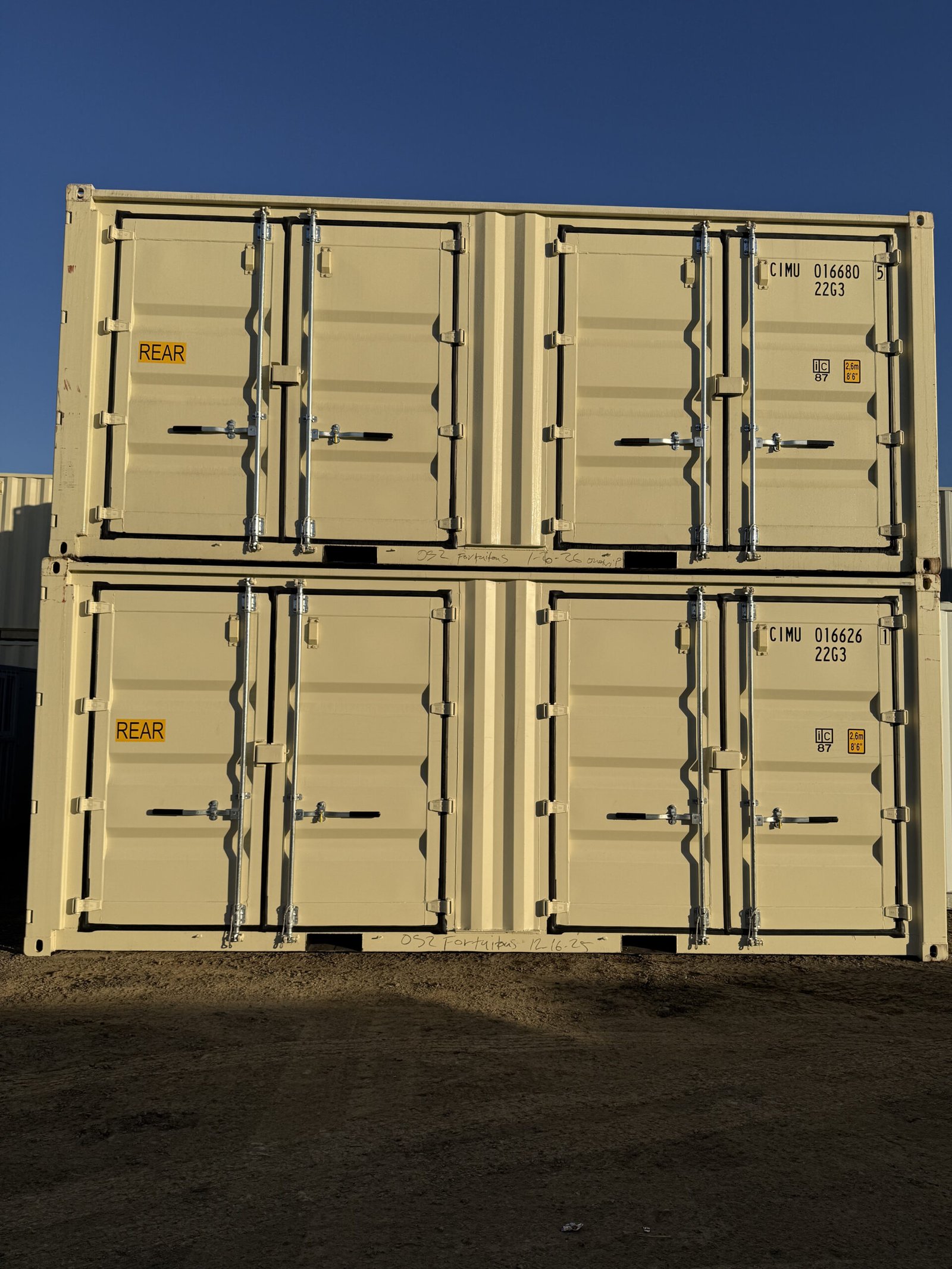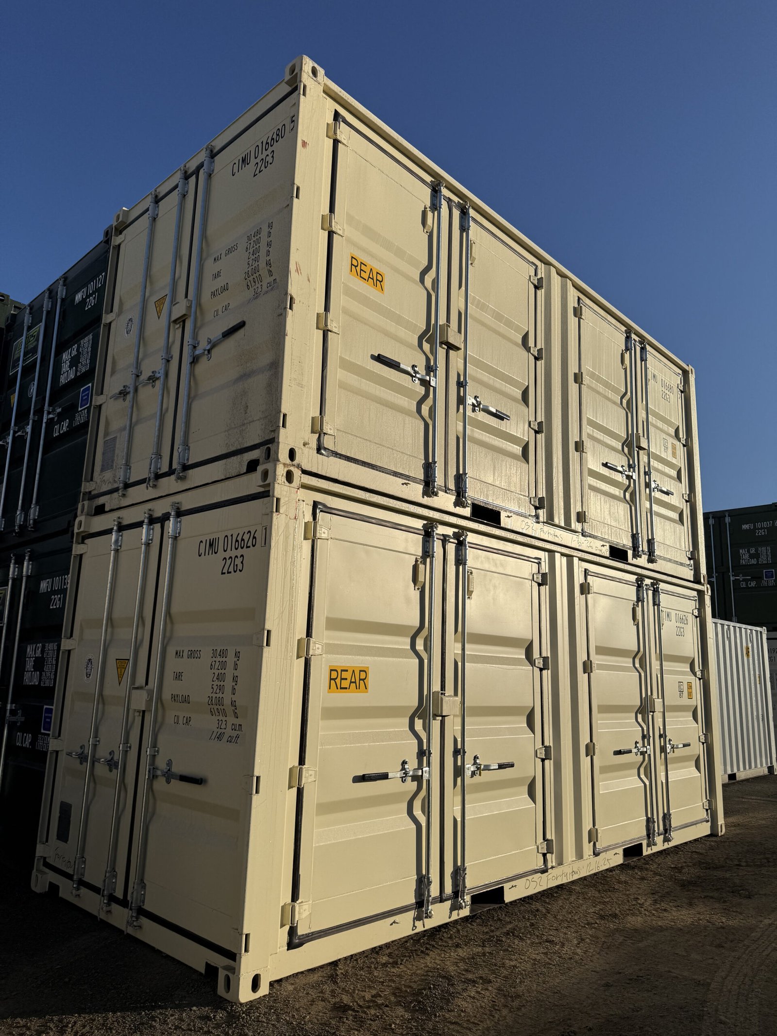 20′ New Beige Container with Cargo Doors on one end and two sets of cargo doors on one side.