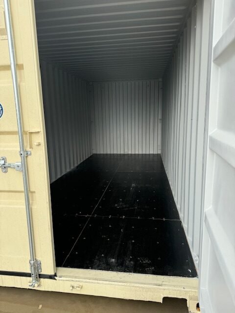 The container retains its original factory-applied beige finish, giving it a clean, modern look without the inconsistencies of aftermarket paint. The flooring is marine-grade plywood, supported by steel cross members, and protected with a factory-applied undercoating to resist moisture and rot.